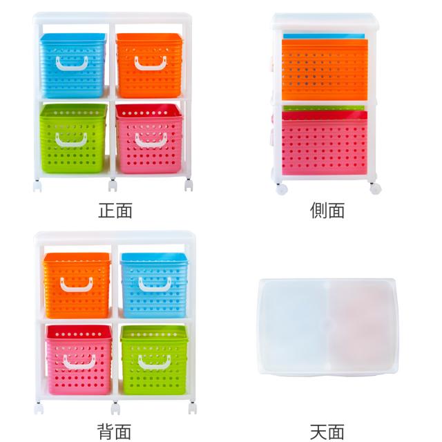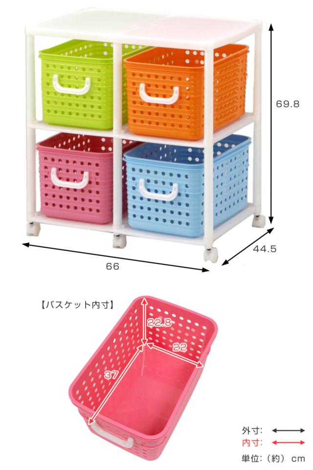 おもちゃ箱 幅66cm スリム バスケットラック 2段 キャスター付き バスケット 4個付き ( かご オモチャ入れ 収納ボックス ラック 衣類 収納 大容量 簡単組立 プラスチック 子供 子ども 引き出し ランドセルラック ランドリーラック )