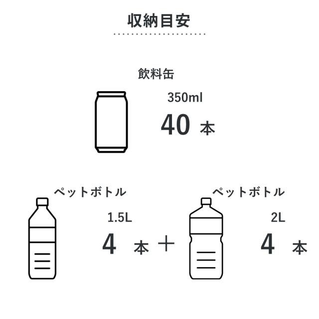 ●350mlの缶は40本、1.5Lのペットボトル4本+2Lのペットボトル4本を収納することができます。