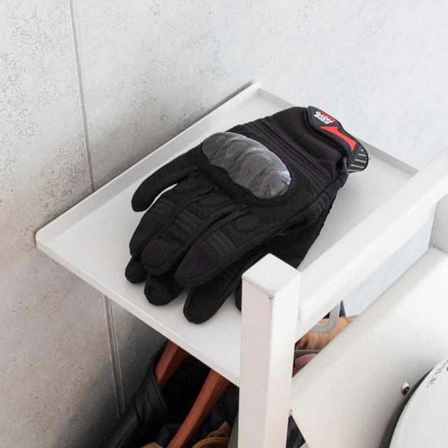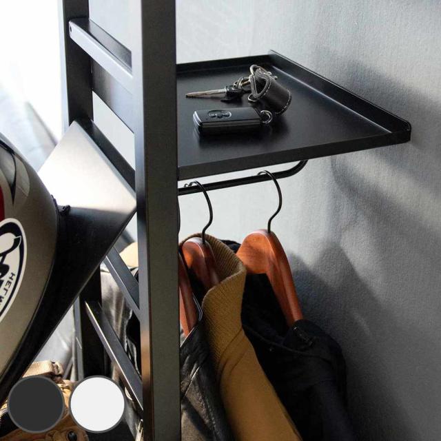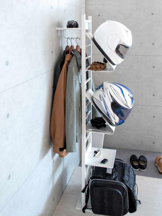ライダーに大人気のヘルメット収納シリーズ「GALEA(ガレア)」のヘルメットディスプレイスタンド用追加棚です。面倒な組み立ては不要で、スタンドに掛けるだけでキーやグローブなどの収納スペースを増やすことができます。さらに、ジャケットやレインウェアを掛けられるハンガーバーも付いているので、お出かけ前の準備もスムーズです。