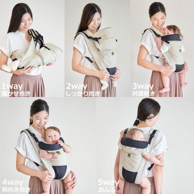 新生児の寝かせ抱きから3歳まで、5通りに使える抱っこひもです。ウエストベルトがないので妊娠中や帝王切開のあともお腹を締め付けずに使用できます。表生地は撥水性のある生地で汚れにくく、裏地はメッシュ生地を使用しているので洗濯しても乾きやすいのでこまめに洗濯できます。