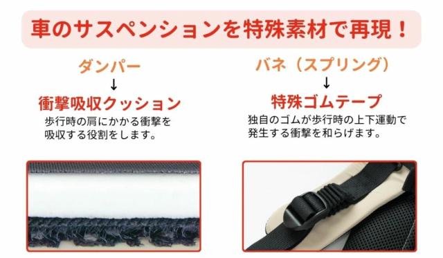 車のサスペンションはバネとダンパーが走行時に路面の凸凹による衝撃を吸収し、振動を伝えない役割があります。これを抱っこひもにも応用し、特殊素材でサスペンションを再現しました。歩行時の上下運動による衝撃を和らげてくれるので体への負担が少なくすみます。