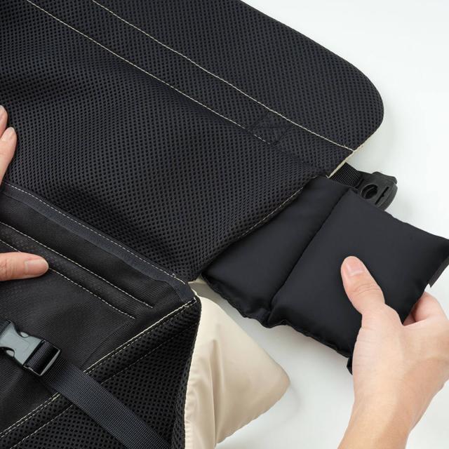 | サイズ | 本体:約 縦62×横46(cm) ショルダーベルト:約 93〜143(cm) ブリッジベルト:約 8〜41(cm) ピロ—:約 縦10×横25×高さ4(cm) ショルダーカバー:約 縦16×横21.5(cm) |