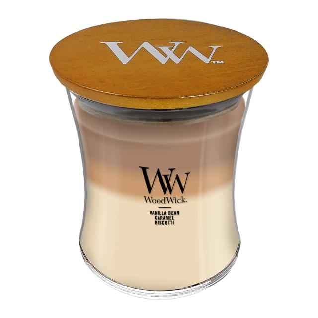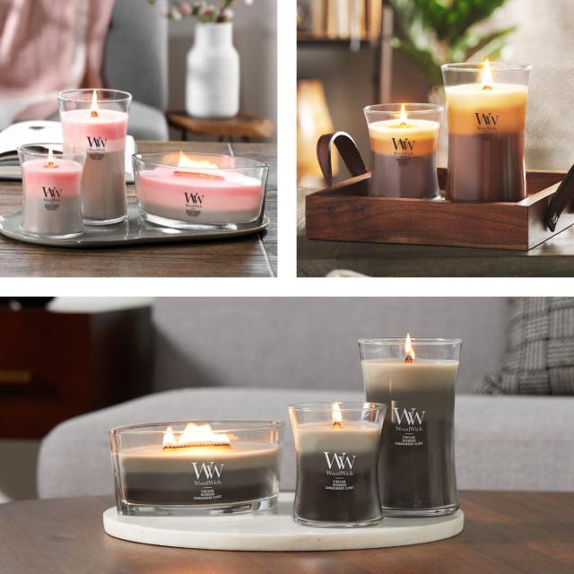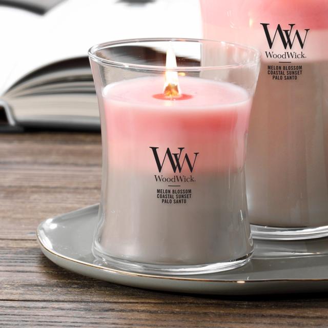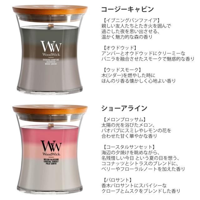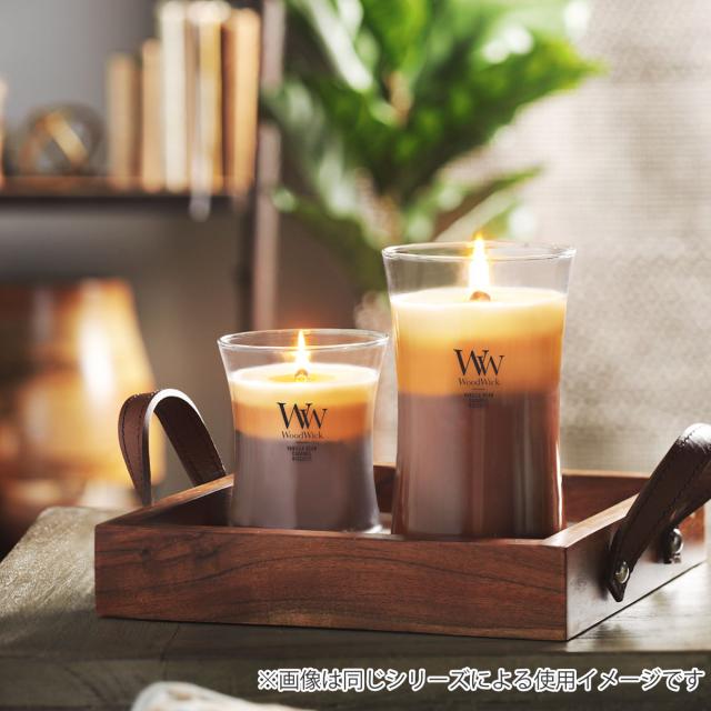 火を灯すと”パチパチ”と木芯がはぜる心地よい音が聞こえ、上質な香りが空間に広がります。そんな癒しのひと時に寄り添うウッドウィックシリーズのキャンドル「トリロジー ジャーM」です。3層のカラーグラデーションが美しいトリロジーは、層ごとに違ったプレミアムフレグランスを配合しています。