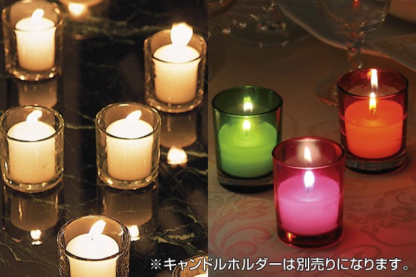 点火しやすいように芯に加工が施されているので、イベントなどで安心してご利用いただけるキャンドルです。ご使用時は必ずキャンドルポットやキャンドルホルダーに入れてください。上手に使うには、コップ型のキャンドルホルダーがおすすめです。コップ型の容器ならロウが流れだすこともなく、容器の中で溶けて燃焼するので、無駄なく使い切ることができます。※燃焼時間:約4時間