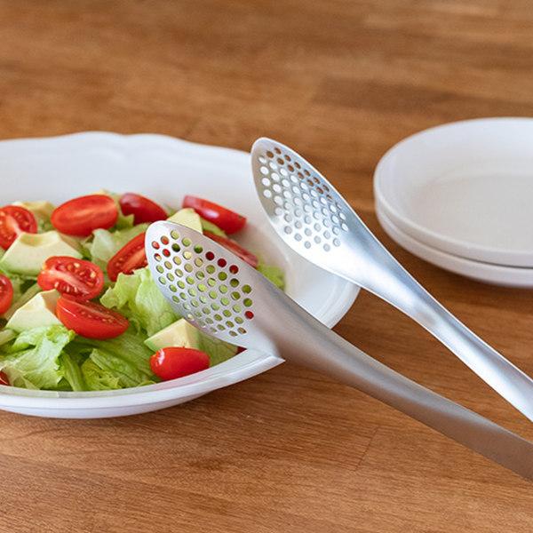 先端は穴が開いており余計な水分・油が抜けるので、ターナー代わりとしても使えます。先端部分が太めで大きいので安定して食材を掴むことができ、使いやすいです。油物の調理やサラダの取り分け、食材やドレッシングなど全体をしっかりと混ぜ合わせることも出来ます。継ぎ目のない一体成型で汚れが溜まりにくく、洗いやすいです。