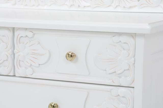 エレガントな彫刻と猫脚、6杯の引出しでたっぷり収納ができるアンティーク風ワイドチェストです。細部まで惜しみなく施された浮彫りのデザインは、職人が一つ一つ丁寧に仕上げています。