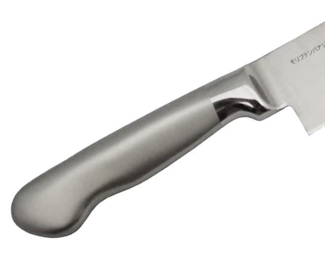 肉にも野菜にも使える三徳包丁です。穴あき・リブ付きで、切り離れ抜群です。刃部は切れ味の良い素材、モリブデンバナジウム鋼を使用しています。