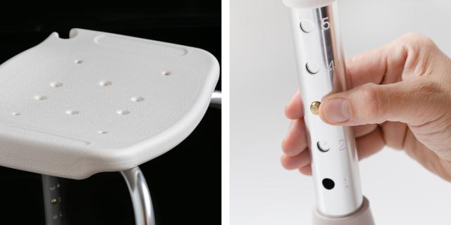 | 丸みを帯びたフォルム カーブしている座面がフィットします。 | 高さ調節は工具不要のボタン式 ボタンを押しながら脚部をスライドさせるだけで、座面の高さを調節できます。 |