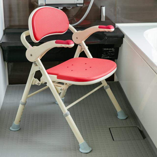 狭い浴室でも場所を取らず、ご家族の方にも邪魔になりません。着替えや髪を乾かす時など、脱衣所での腰掛けとしても使えます。