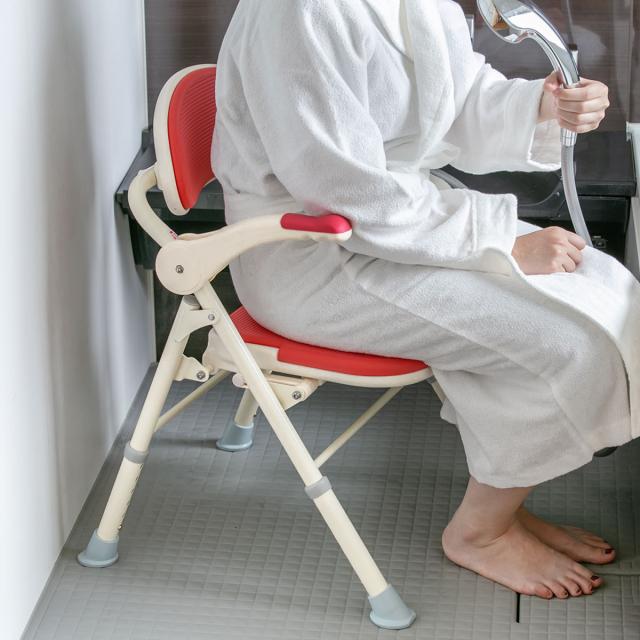 入浴時の姿勢を安定させたり、浴室内での転倒を予防するなど、安心して入浴していただくためのシャワーチェアーです。湯気で視界が悪くなっても目立ちやすい赤色です。
