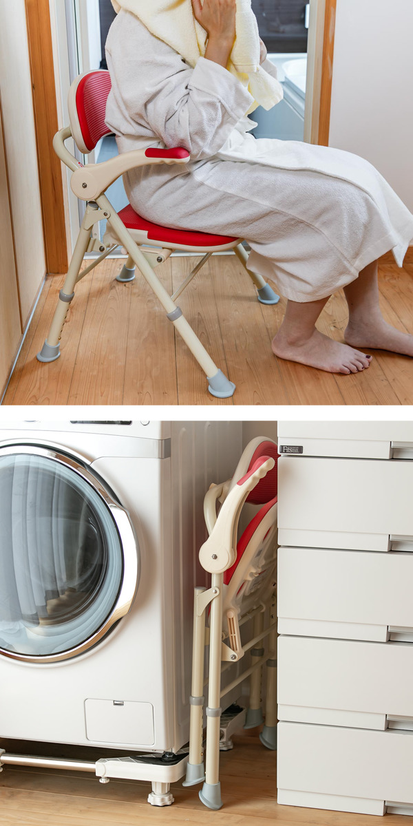 着替えや髪を乾かす時など、脱衣所での腰掛けとしても使えます。折りたたんで洗濯機と洗面台の間などの狭いすき間にも収まります。