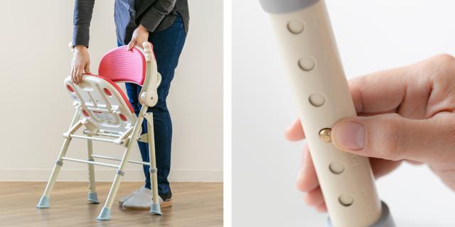 | 座面を上げて折りたたみ 開くときは座面を下げるだけです。必要なときにパッと使えます。 | 高さ調節は工具不要のボタン式 ボタンを押しながら脚部をスライドさせるだけで、座面の高さを調節できます。 |