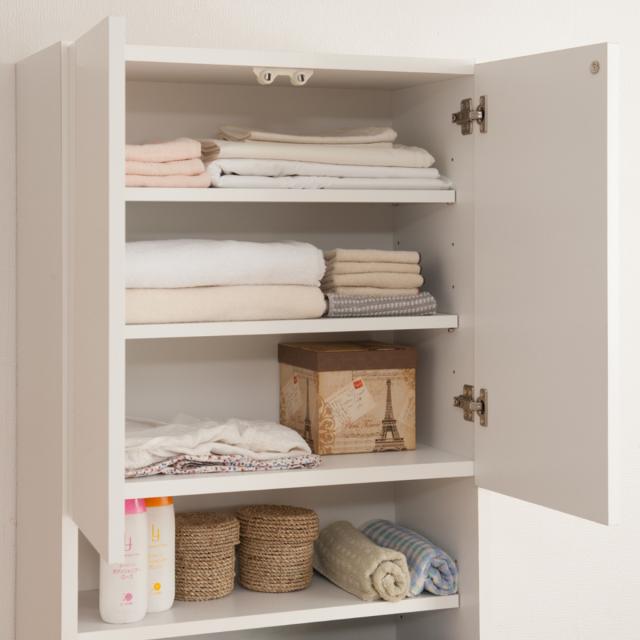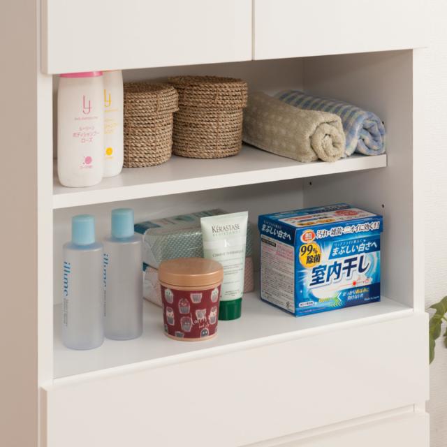 ボトルや掃除小物などよく使う物の収納に最適です。オープンスペースにも可動棚が1枚付いています。