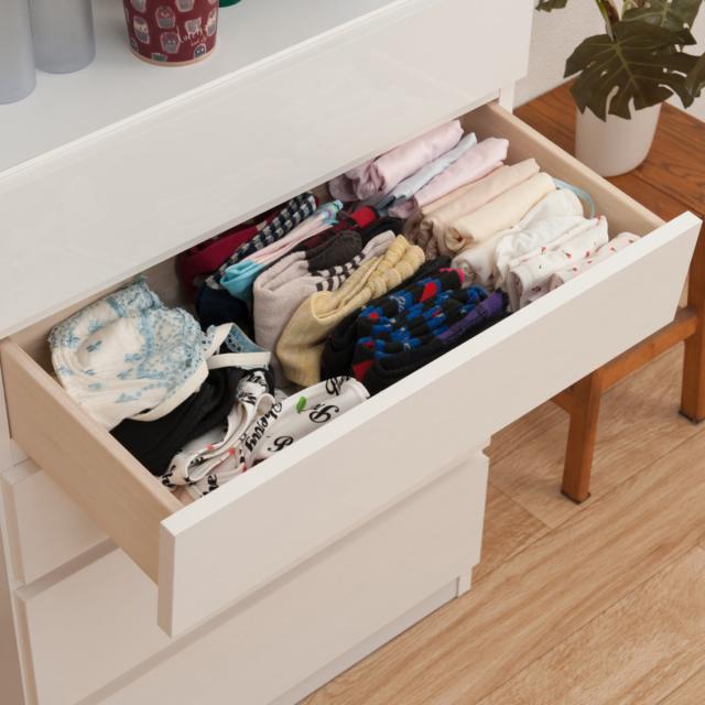 5段ある引き出しには家族の着替えやタオル、下着等様々なものが収納出来ます。ご家族で引き出しを分けて使用したり、収納物を分けたり使い方は自由自在です。