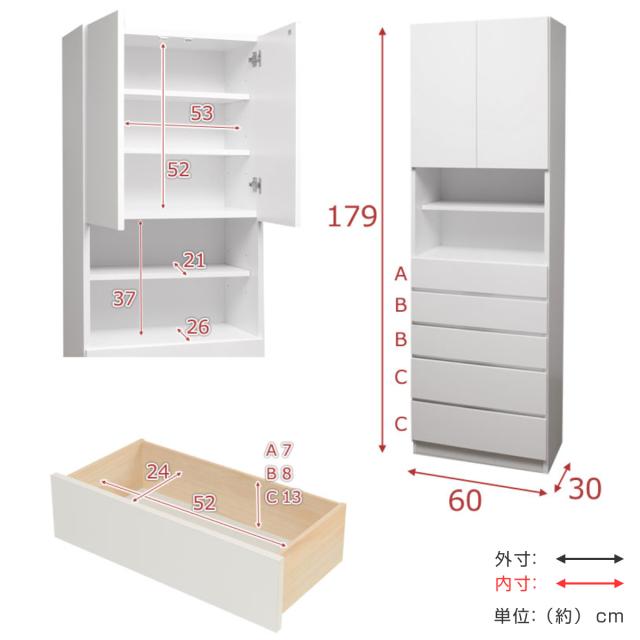 | サイズ | 約 幅60×奥行30×高さ179(cm) 引き出し内寸:約 幅52×奥行24×深さ(浅)7(中)8(深)13(cm) |