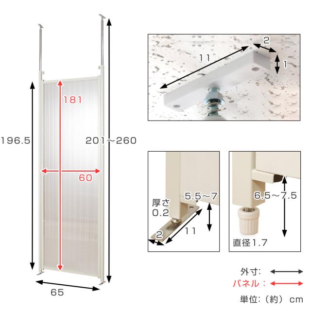 | サイズ | 本体:約 幅65×奥行2.5×高さ201〜260(cm) パネル:約 幅60×奥行2.5×高さ181(cm) 補助金具脚:奥行 約11cm |