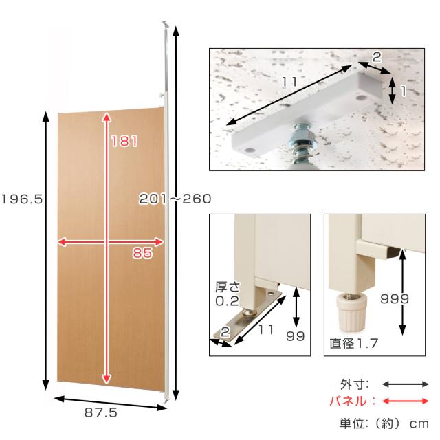 | サイズ | 本体:約 幅87.5×奥行2.5×高さ201〜260(cm) パネル:約 幅85×奥行2.5×高さ181(cm) 補助金具脚:奥行 約11cm |