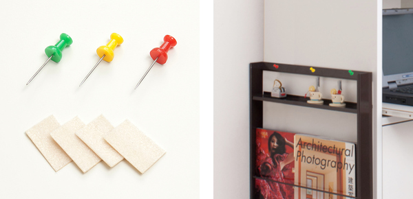薄型なので、お手持ちの家具の背面に取り付ければ、間仕切りとしても便利にお使いいただけます。デスク横やリビングの隙間、お部屋にあるデッドスペースに取り付けて、見せる収納を楽しむのもおすすめです。