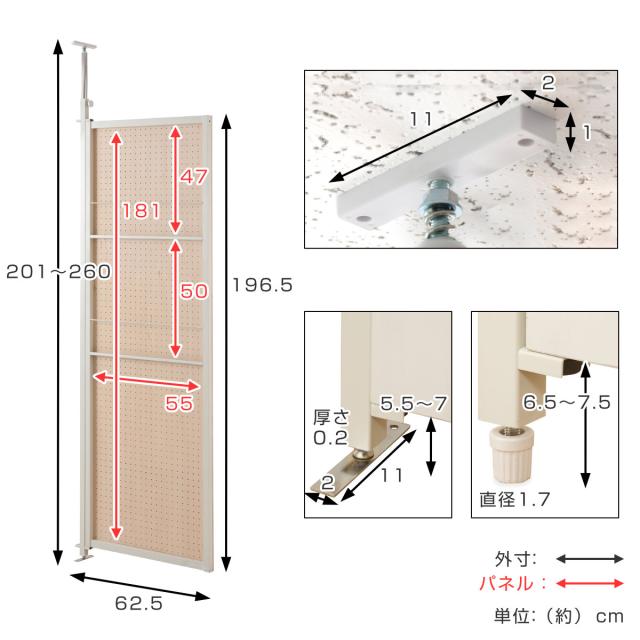 | サイズ | 約 幅62.5×奥行3(上下T字部11)×高さ201〜260(cm) 目隠し部高さ(地面より):186(cm) マガジンラック部:(約)幅55×奥行2×高さ(上)47(下)50(cm) フック出幅:(約)3.5(cm) |