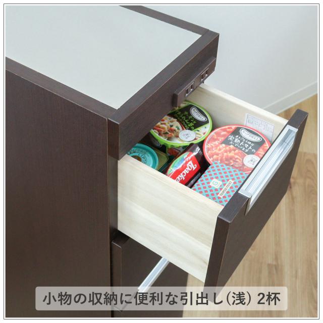 上2段の引出しは浅めで、収納した物が取り出しやすいので、キッチンの細々とした小物を綺麗に収納できます。抜け落ち防止のストッパー付きです。