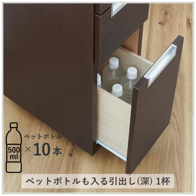 最下段の深型の引出しには、500mlのペットボトルを10本収納できます。スライドレール付きで重い物を入れても、開閉がスムーズです。