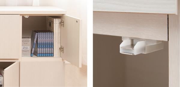 | 便利な配線穴付き 下段の扉内にはそれぞれ配線穴付きです。ごちゃついた配線周りもスッキリまとめることができます。 | 金具が隠れるスライド蝶番使用 扉の内側に蝶番がついているので外からは金具などが見えないようになっています。 |