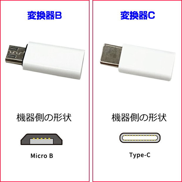 | 変換コネクタについて 使用するスマートフォン・タブレット等のポートの形状(Micro BまたはType C)を必ずご確認の上、お求めください。 |