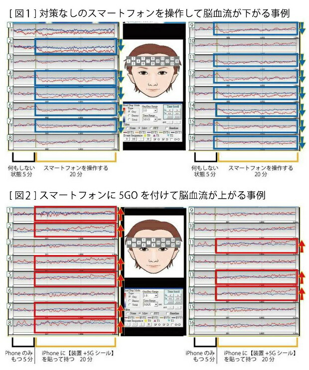 | 何もしないスマホを使用時に比べ、5GOLightningを装着したスマホはノイズが低減していることがはっきりと確認できます。 さらに、何もしないスマホの使用時は脳血流が下がるが、5GOLightningを装着したスマホの使用時は脳血流が上がることもはっきりと確認できます。 |
