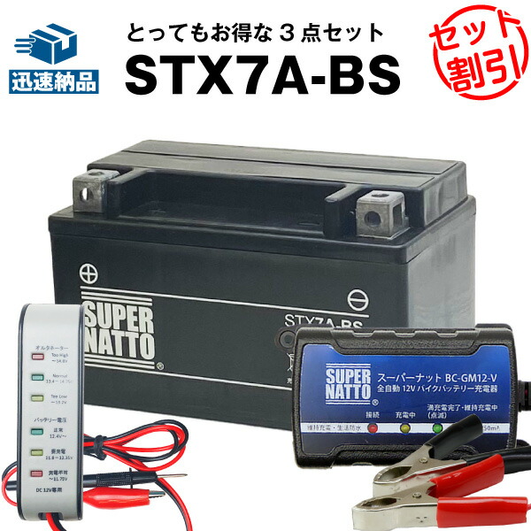 バイクバッテリー充電器+バッテリー電圧テスター(12V用)+STX7A-BSセット■YTX7A-BSに互換■【送料無料】【特別割引】シグナス XLR125R、マジェスティ125、ヴェクスター125、バンディット250、アヴェニス150、イナズマ、アドレスV125、スカイウェイブ250 他