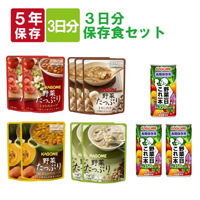 カゴメの野菜たっぷり 3日分保存食セット 野菜たっぷりスープ カゴメ野菜一日これ一本 KAGOME 長期保存 備蓄食品 野菜の保存食 野菜ジュース (非常食 セット 保存食 セット 防災セット 防災食 非常用 防災 食品