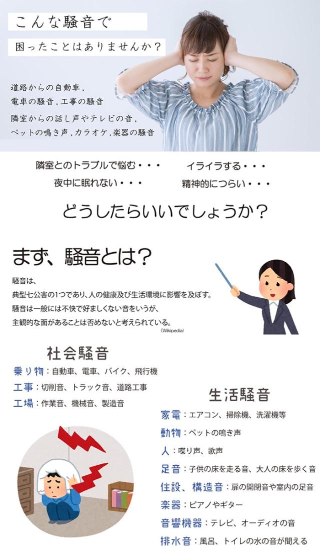 | ■防音計画の目安 音の感じ方は個人差がありますが、一般的に快適と感じられる環境は40dB (デシベル)と言われています。 例えば、ピアノは88〜100dB、地下鉄の車内は 80dBくらいです。 騒音の程度は、60dB を超えると『うるさい』と感じ、 80dB以上になると『極めてうるさく感じる』と警告されています。 防音計画は、家の回りの環境やピアノなど楽器を弾く人がいるか、 オーディオを楽しむ趣味があるかなどを検討し進めていくとよいでしょう。 |