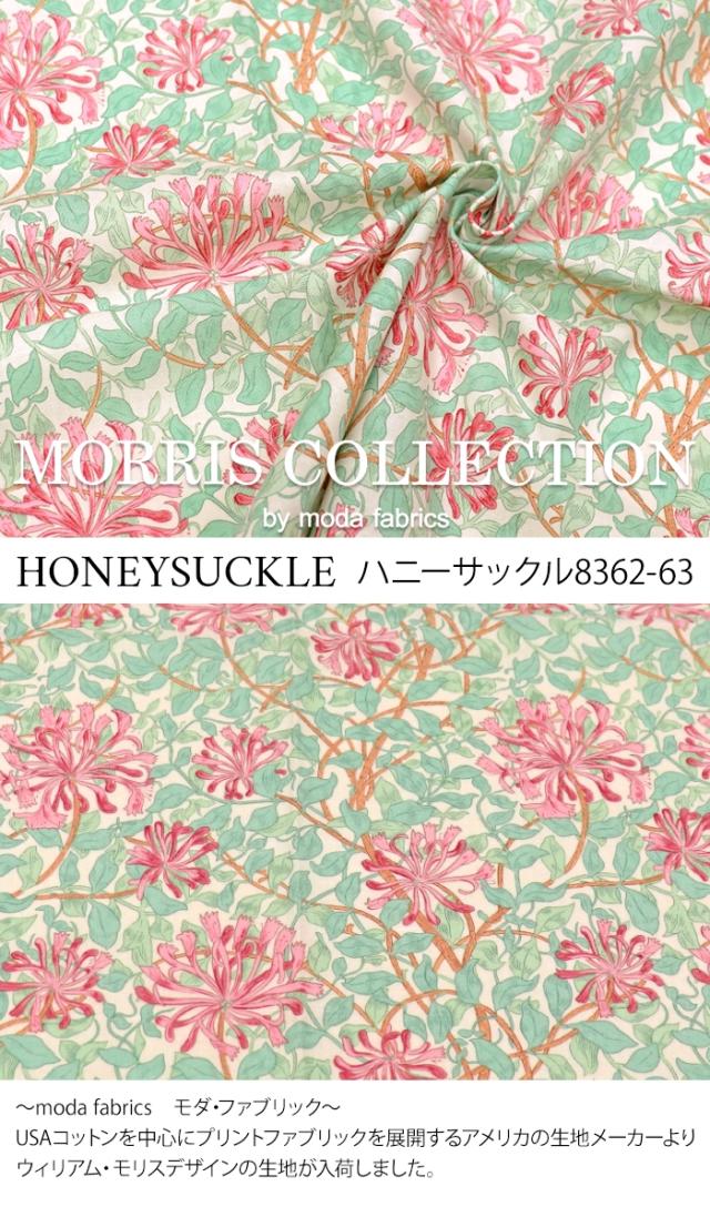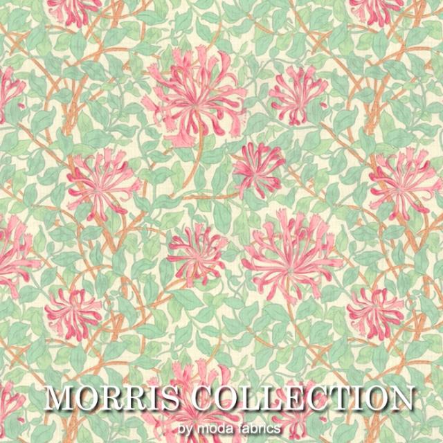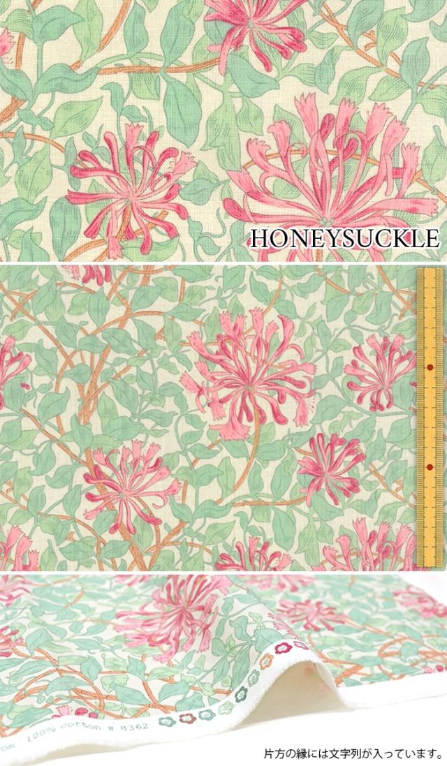 モリス柄 デザイン生地 モダ・ファブリックス 約幅110cm 10センチ単位 切り売り (10cmあたり) ハニーサックル 8362-63 (Y) 日本製 シーチング生地 布 布地 手芸 コットン100% スイカズラ ロセニア ピンク アイボリー グリーン ボタニカル 植物 生地 花柄 切売り販売