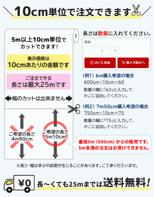 (例:5m50cm欲しい場合は、個数の欄に「55」と入力してください。)