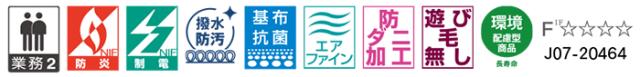 ■機能:防炎(防炎性能試験番号 EO070060)、制電、撥水防汚(フッ素系樹脂による防汚加工)、抗菌、エアファイン(消臭)、防ダニ加工、遊び毛無し、低炭素商品、F☆☆☆☆(ホルムアルデヒド対応)