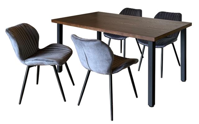天然木の天板と、ブラックのアイアン脚とのコントラストが特徴的なダイニングテーブル。
