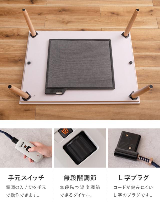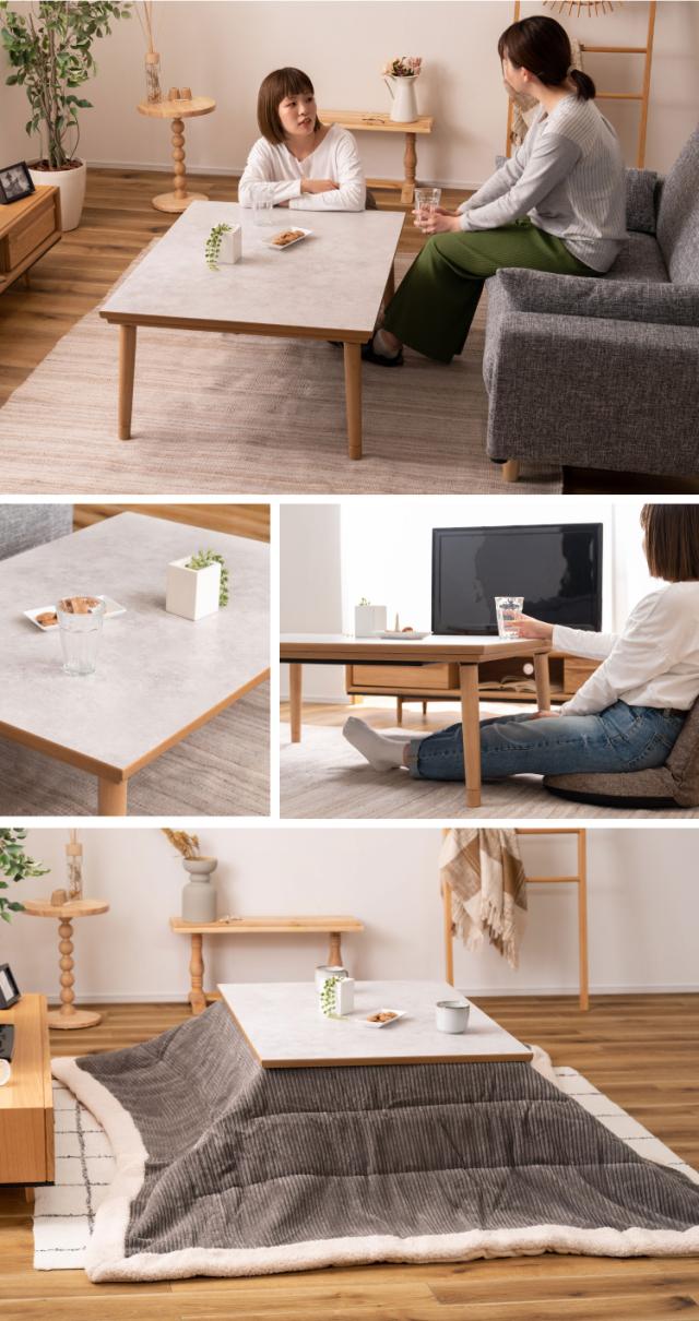 大理石調のストーン柄の天板とナチュラルな木目の組み合わせ。すっきりとしたデザインとこだわりの機能を兼ね備えた自慢のこたつです。