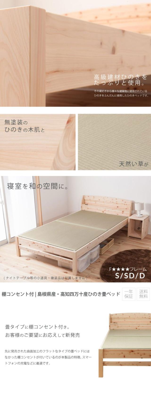 ベッドフレーム ダブル 棚コンセント付 島根県産・高知四万十産ひのき畳ベッド ベットフレーム ベッド ベット 寝具 インテリア 家具 TCB243 D ダブルサイズ Dサイズ(代引不可)【送料無料】