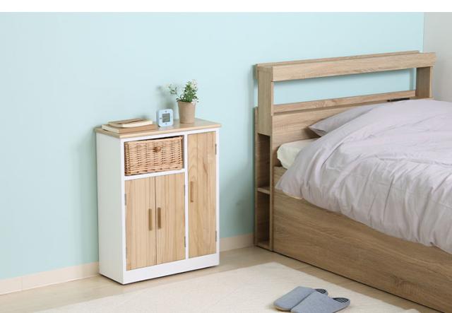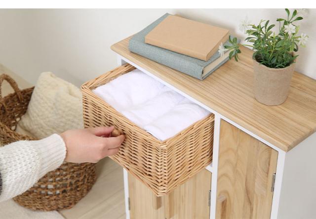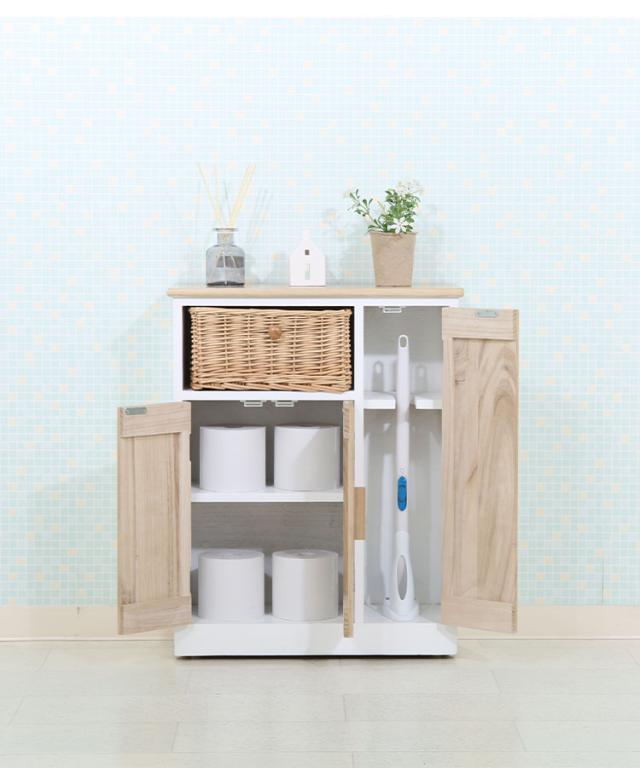 トイレで使うアイテムをすっきり、たっぷり収納できるワイドサイズのラックです。右扉収納部分には背の高いブラシも収納可能で、柄の部分も気にせずに収納できます。傷や水に強い、ラッカー塗装仕様です。清潔感のある白を基調としながら、木の桐を使い、どの部屋にも溶け込むナチュラルデザインです。