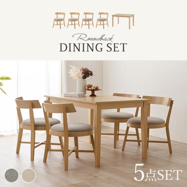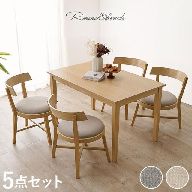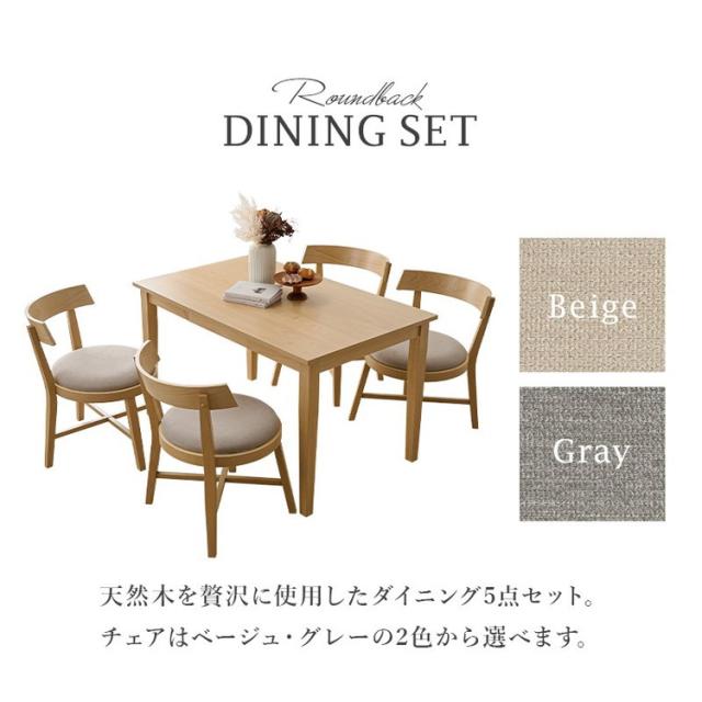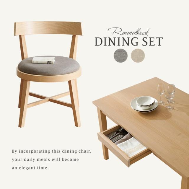 天然木を贅沢に使用したダイニング5点セット。チェアの丸みを帯びた愛らしいシルエットが空間を柔らかに演出します。テーブルは便利な引き出し付き。
