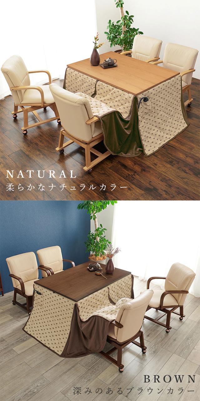 ダイニングタイプのこたつに、布団とチェアが付いた6点セット。暖かな団らんの場が作れます。