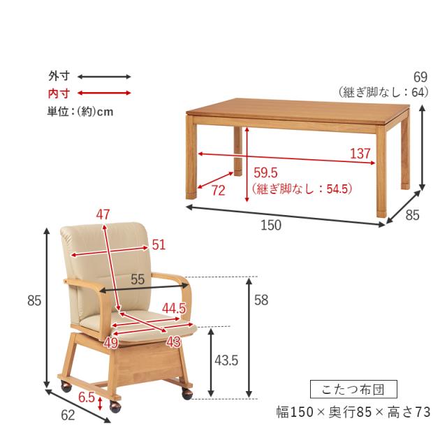 コタツ:(約)幅150×奥行85×高さ64/69cm