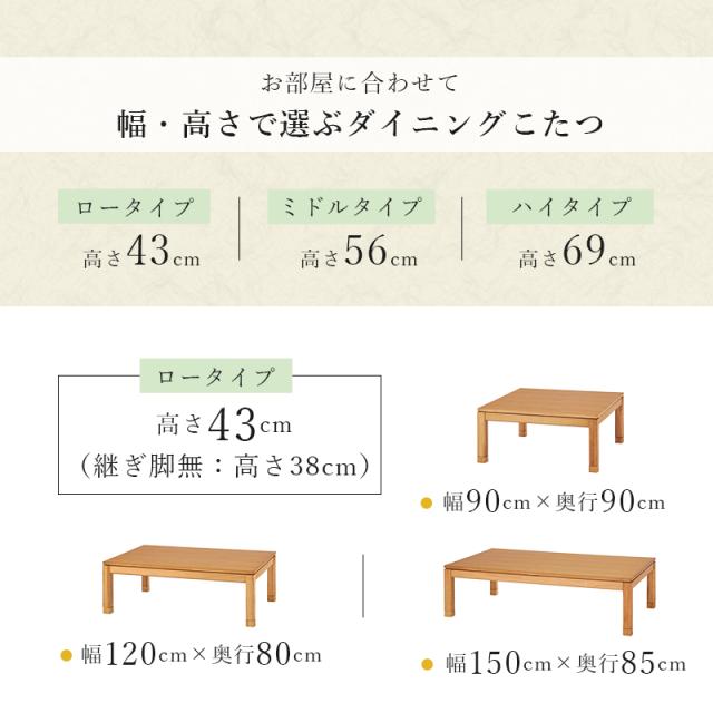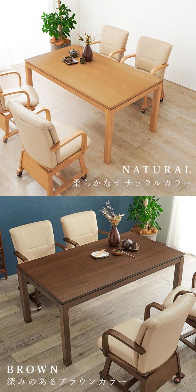 天然木のぬくもりを感じられるダイニングこたつテーブル。5cmの継脚付きで椅子に合わせて高さを変えられます。