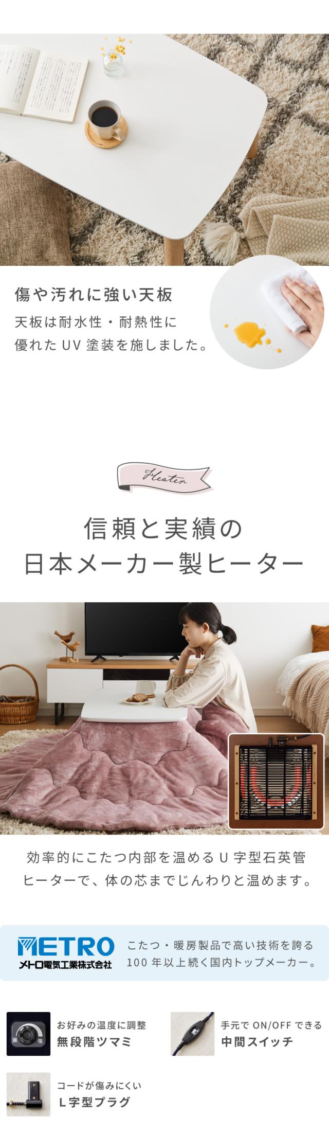 こたつ、暖房製品で高い技術を誇るメトロ電気工業株式会社のヒーターを採用。