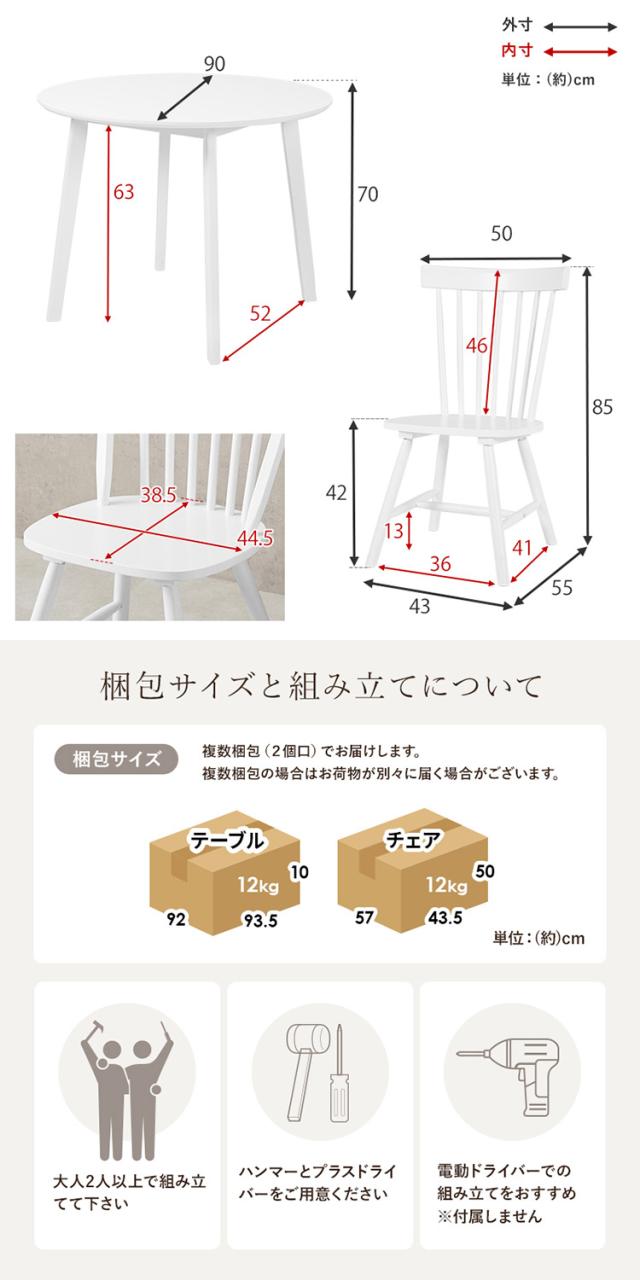 テーブル:(約)幅90×奥行90×高さ70cm、チェア:(約)幅50×奥行55×高さ85×座面高42cm