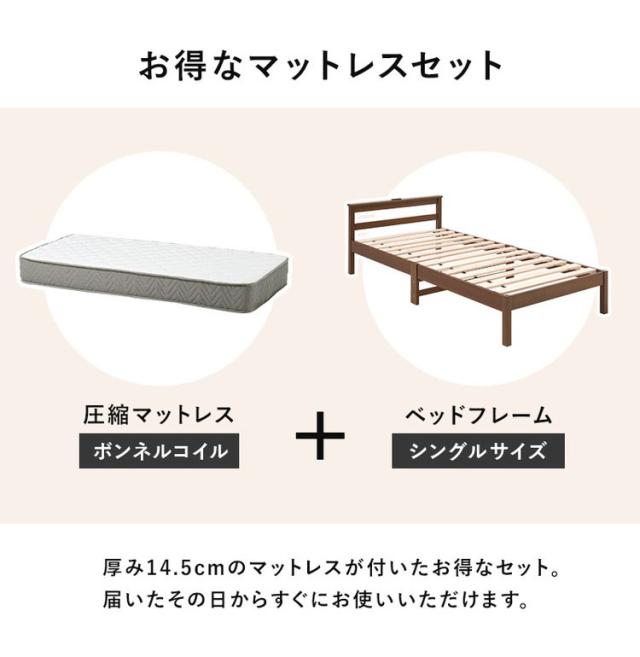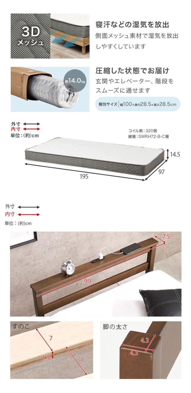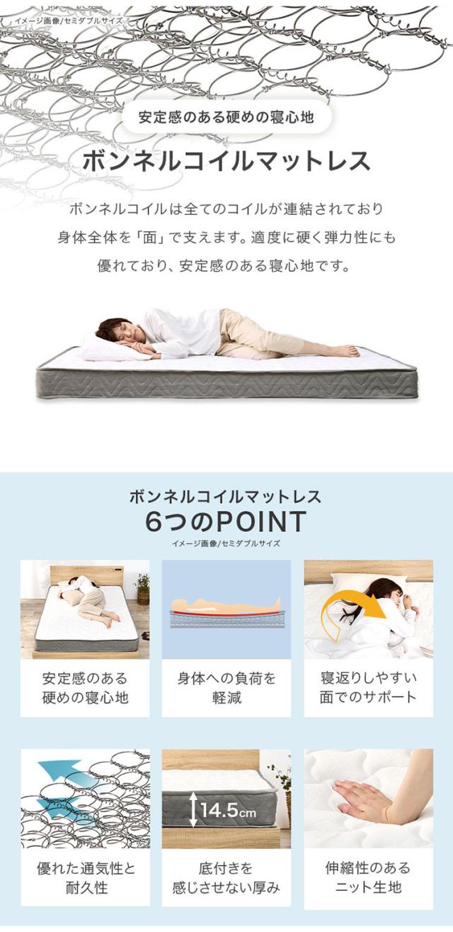 ベッド:ベッド:天然木(ラバーウッド)・プリント化粧パーティクルボード、マットレス:ボンネルコイルポリエステル