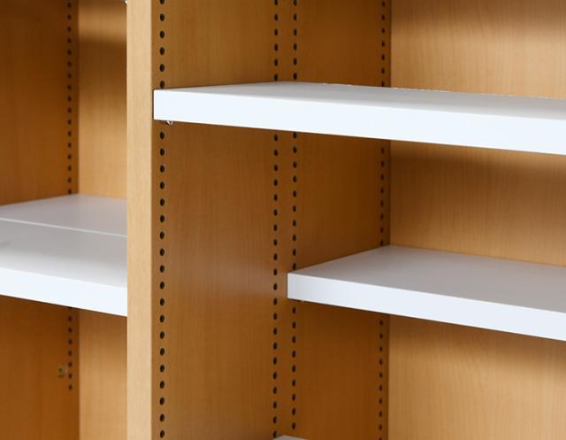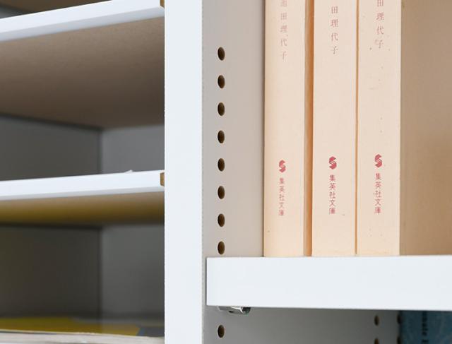 棚板は1cmピッチで調整できて、前後に分割して使えるので文庫本から辞典までサイズに合わせて効率よく収納できます。