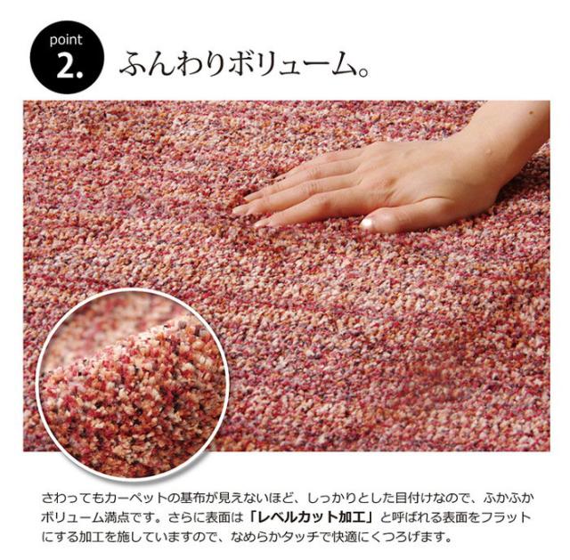 安心の日本製ふんわり多色MIXタフトラグです。多色多サイズ展開、お部屋に合わせてお選び下さい。基布には抗菌・防臭・防ダニ加工を施しておりますので、お子様にも安心です。パイル長約15mm、目付は1平方メートルあたり840gのボリュームタイプです。触っても基布が見えないくらいのふかふか、モコモコのボリュームを実感して下さい。パイル部分はレベルカット加工(表面をフラットにする加工)を施しておりますので、ふんわり柔らかい肌触りです。ホットカーペット、床暖房対応にも対応しています。