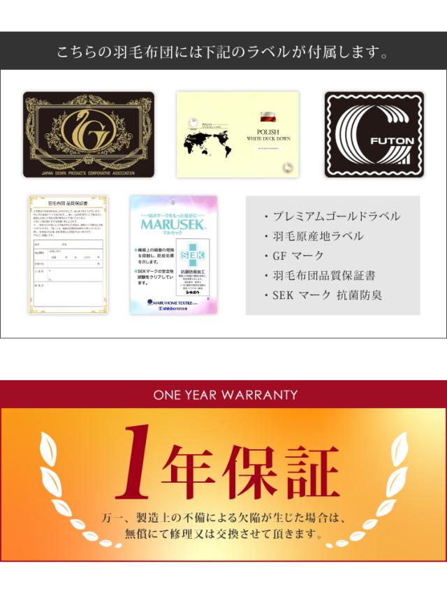 ※羽毛は天然素材のため、無臭ではございません。原毛は洗浄を十分に行っておりますが、開梱直後や温度・湿度等の環境等により臭いを感じる場合がございますので、開封直後には風通しの良い場所での十分な陰干し等をお勧めいたします。なお、天然羽毛の臭いのため人体に害はございませんのでご安心ください。