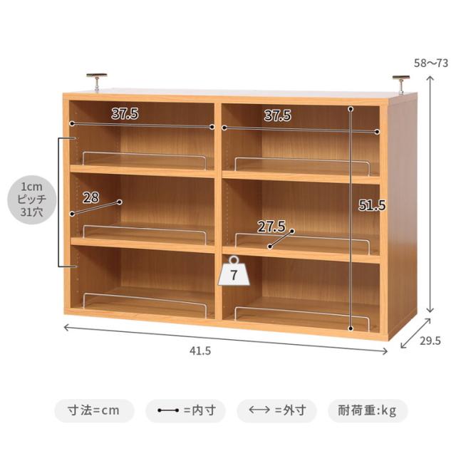 本体上の空間を有効活用する為の、専用上置き。本体同様に、1cm間隔で棚板が設置可能なので、様々なものが効率的に収納可能。深型だから、文庫本や大きな辞書はもちろん、本だけでなく雑貨まで収納。深型幅81専用上置き