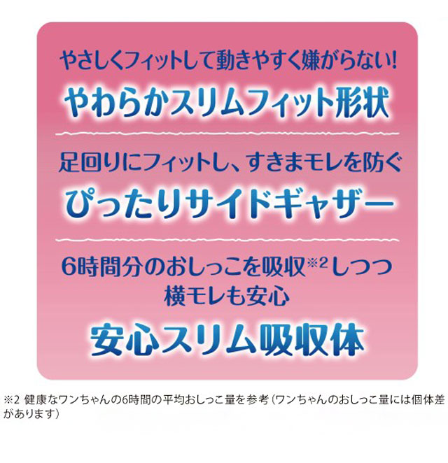 そそう・生理に安心。お出かけ先でもおうちでも!「やわらかスリムフィット形状」で、やさしくフィットして動きやすく嫌がらない。「ぴったりサイドギャザー」で、足回りにフィットし、すきまモレを防ぐ。「安心スリム吸収体」で、6時間分のおしっこを吸収※健康なワンちゃんの6時間の平均おしっこ量を参考(ワンちゃんのおしっこ量には個体差があります)